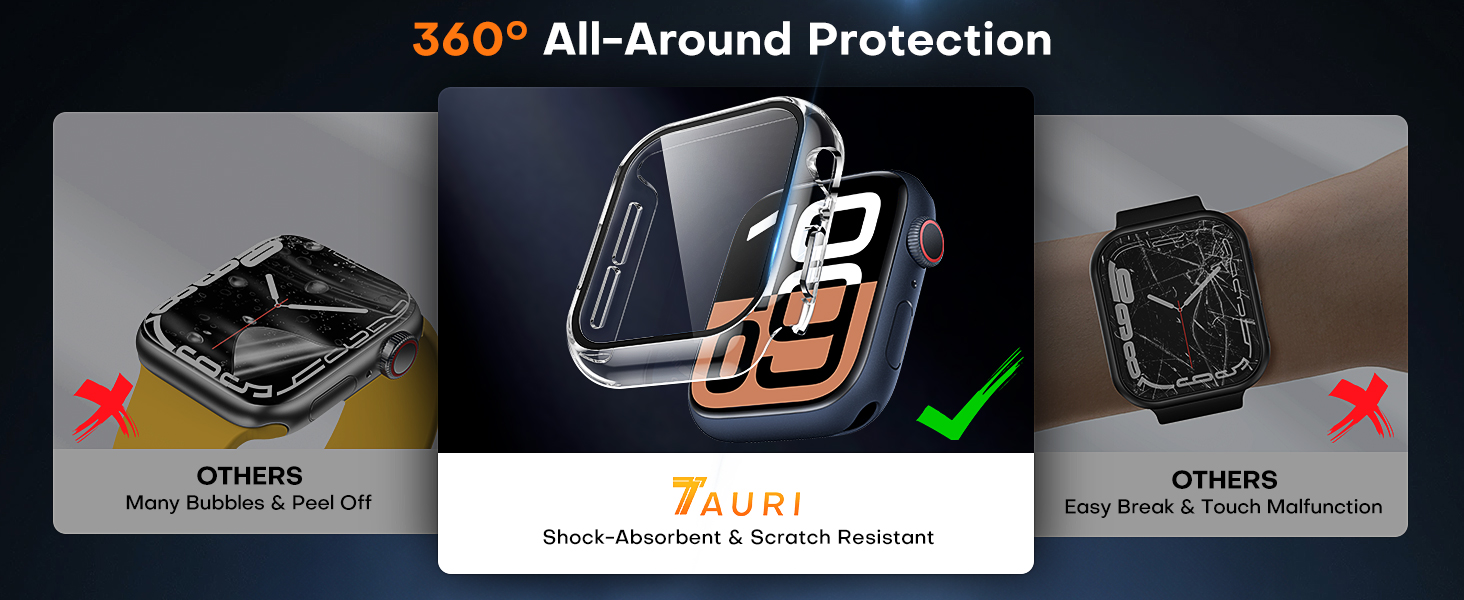 The TAURI 2 Pack Hard Case for Apple Watch Series 10 (42mm) offers comprehensive protection with a 360° shockproof design and a 9H tempered glass screen protector. Its ultra-thin, scratch-resistant cover ensures a sleek look while providing easy installation and dedicated customer support.