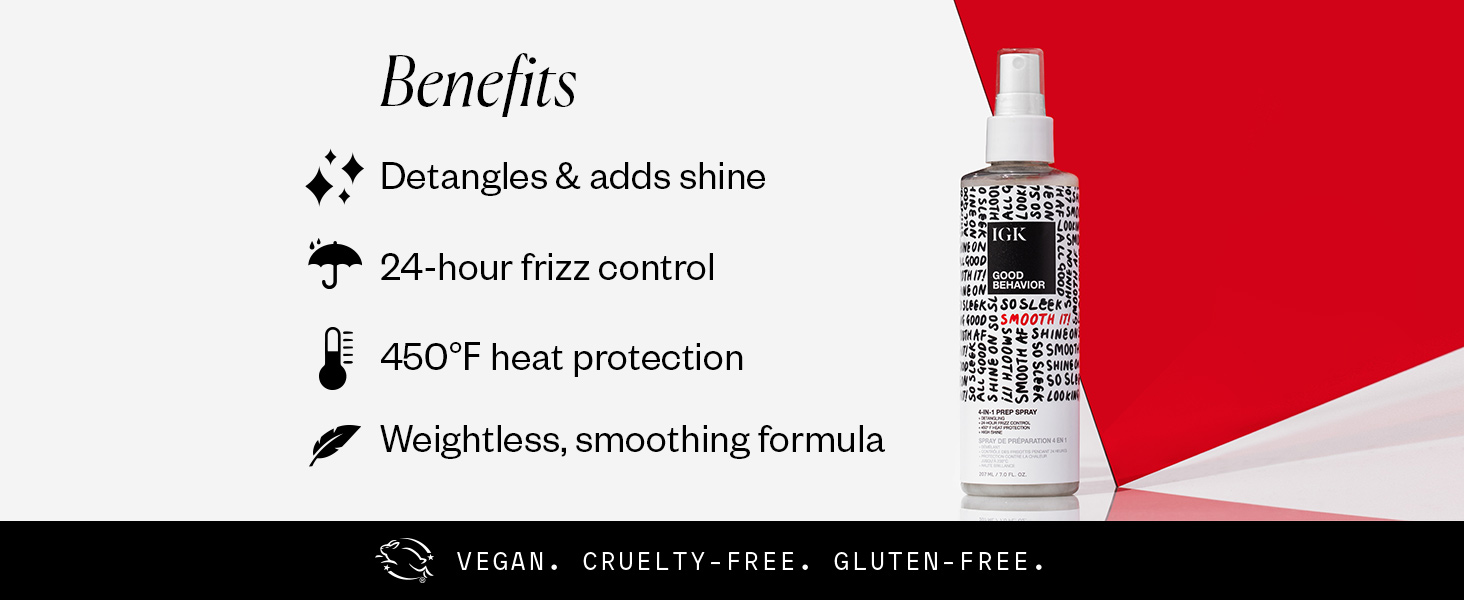 IGK Good Behavior 4-in-1 Prep Spray is a vegan, cruelty-free leave-in treatment that detangles hair, provides up to 450° heat protection, fights frizz for 24 hours, and boosts shine with nourishing spirulina protein and coconut oil. Available in a convenient 7 oz pack of 2, it’s the ultimate prep spray for sleek, healthy hair.
