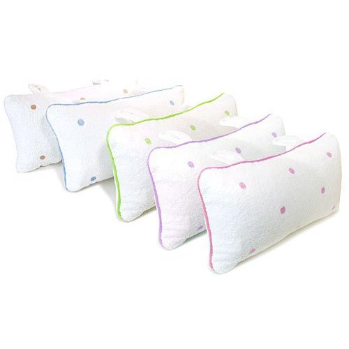 Take a more relaxing bath with our stylish and comfortable luxury pillow. Embroidered with colorful dots, the removable 100% cotton terry cover is machine washable, and the polyfill pillow insert supports your head and neck for bathtime comfort. Simply hang pillow by loops on the suction cups provided. Pillow measures 14" wide by 7" tall.