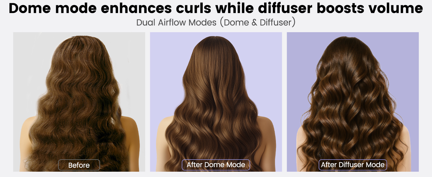 - DUAL AIRFLOW MODES FOR CUSTOM CURL PERFECTION - Switch effortlessly between Dome and Diffuse modes to sculpt dynamic, voluminous curls tailored to your style.
